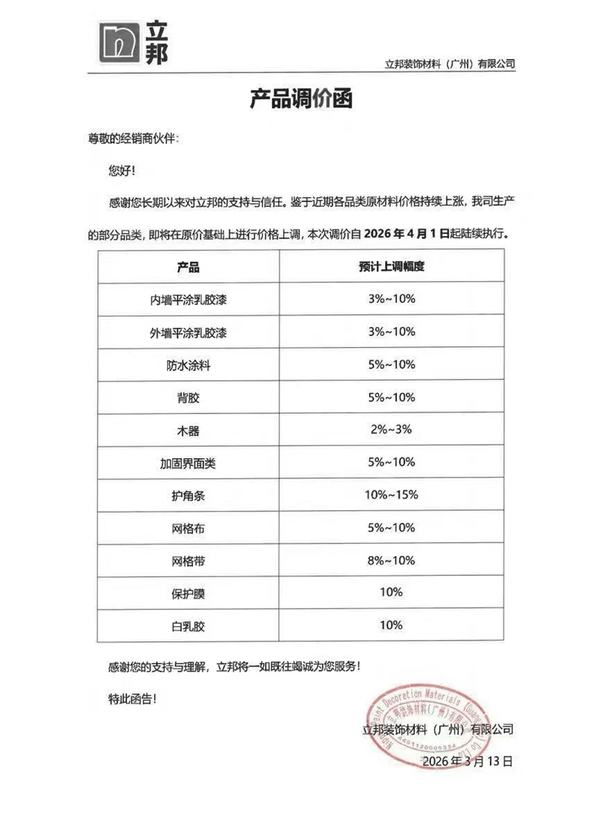 本轮涂料行业集体调价的间接导火索,膜取白乳胶上调10%,龙佰集团的持续跌价,于2026年3月16日发布了第二轮跌价函。本轮跌价将间接推高下逛拆修、工程及工业项目标采购成本。这种分步走的策略旨正在察看市场反映及原料价钱走势,明白将于3月25日17:30起实施新价钱。对于下旅客户而言,