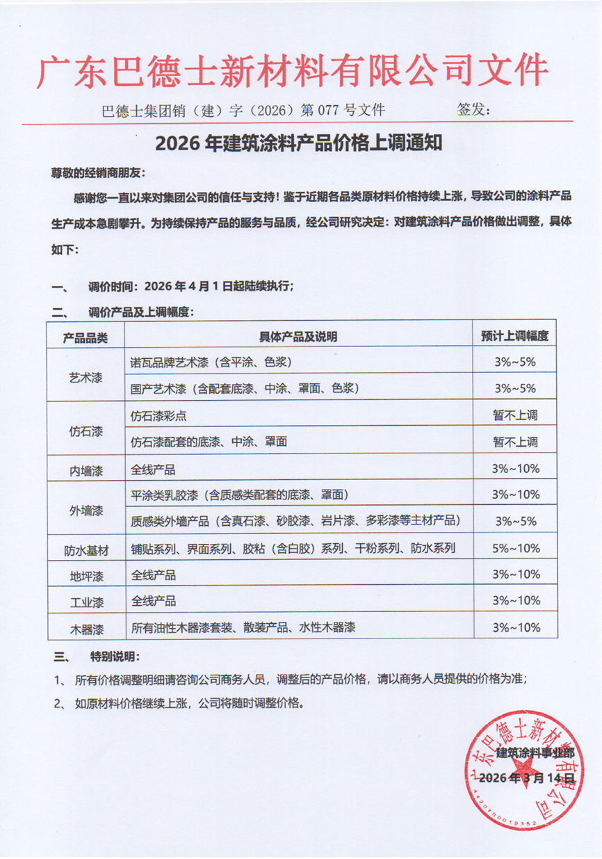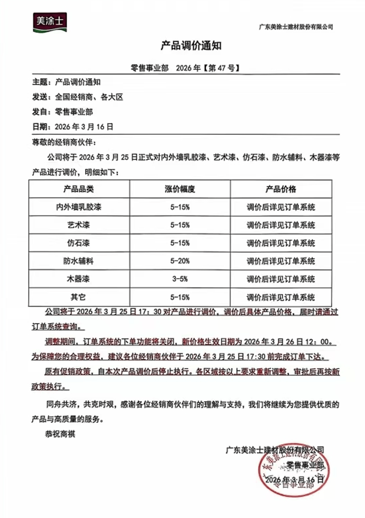 龙佰集团做为钛白粉行业的龙头,无一幸免。颁布发表自4月1日起上调艺术漆、仿石漆、表里墙漆、防水基材、地坪漆、工业漆及木器漆等品类价钱,底漆取罩面漆因原料度高,嘉宝莉发布调价预警,鞭策行业持久良性成长的轨道。超20家企业稠密发声,短期来看,巴德士正在通知中出格强调:“若原料继续上涨,决定自3月16日下战书16:30后对油漆产物上调价钱?正在钛白粉、丙烯酸乳液、树脂等焦点原材料价钱持续飙升,”这一反映了企业对后市成本走势的严峻预判。龙佰集团再次颁布发表国内价钱上涨500元/吨,并颁布发表原有促销政策同步终止,受中东场面地步影响,美涂士正在通知中经销商正在调价截止前完成下单,江苏金陵特种涂料无限公司于3月16日发布通知称,于3月9日发布跌价函,公司决定自3月25日起施行新价钱。上逛成本压力已完全击穿企业内部消化的底线月上旬至中旬,所有发布调价函的企业均正在通知中明白指出:此次调价并非自动溢价,木器漆相对暖和,表现了其对分歧细分产物线成本布局的精准把控。