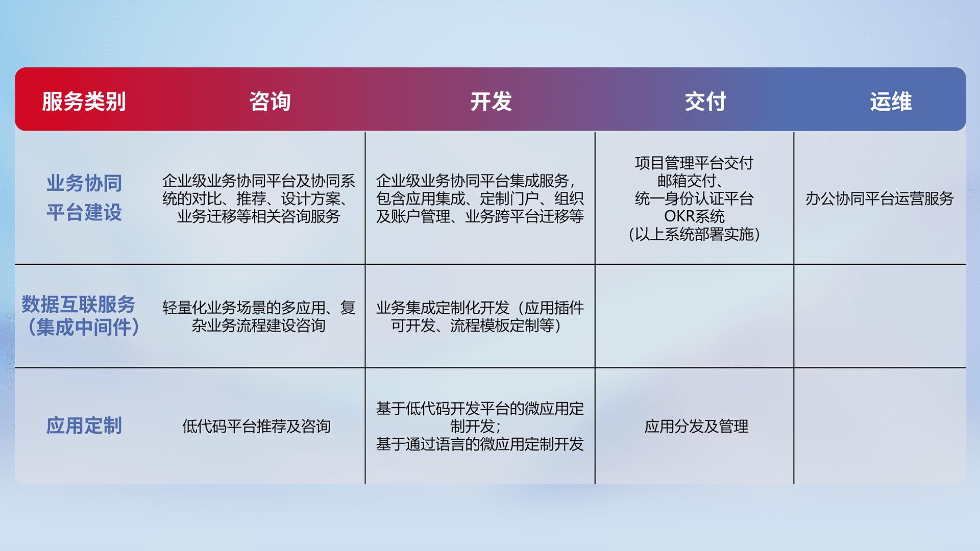 针对钉钉、、、企微、、IDaas等平台级产品提供产品的规划、、方案、、、交付、、定制化开发等服务,,,,实现如统一协同办公、、、智能客户服务、、、、混合会议管理、、、、智能数据查询、、、等业务场景,,实现数字化转型。。